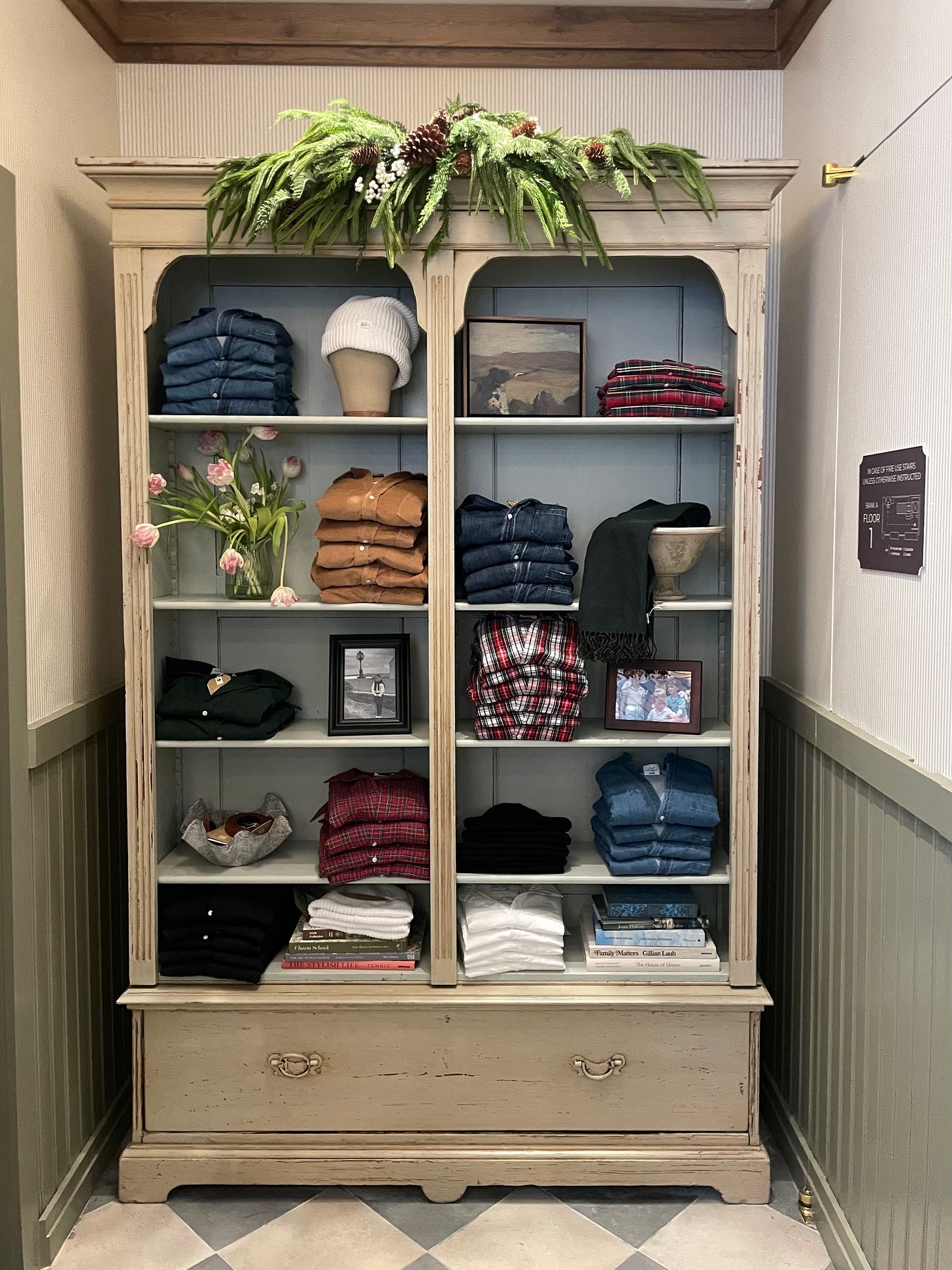 The space was gorgeous. What I loved most is that you could ease through the store as if you were going to room to room in your home. It felt like I was in someone’s colonial. Warm, timeless and exceptionally decorated. There was a rustic kitchen straight out of a Plain English showroom, memories lined the stairwell and wallpapered walls and the waiting area for the fitting rooms had a fireplace in the center with chairs and couches adjacent.